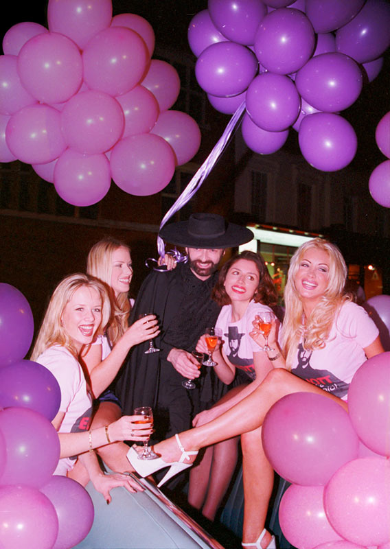 ELLIOTT arriving to open his art exhibition "Art for a New Millennium". Left to right: Sarah, Adele, El Maestro, Kim and Vicky. James Elliott arrived with the girls in a peppermint green 1957 Cadillac Convertible stuffed with hundreds of pink and lilac balloons. The trip from Hampstead to the West End of London with the stereo blasting and the balloons bobbing about, turned heads everywhere - a source of much laughter and delight for the girls. On arrival they were brought a bottle of Champagne - the only alcohol Elliott drinks - from the gallery, which they drank outside before going in. This picture was taken at that point. The arrival was clearly observable by the large crowd inside the gallery, as it boasted the longest gallery window in London at 15 meters (47 feet). Everyone inside burst into spontaneous applause as James Elliott and the girls entered the gallery. The Times noted : "To describe him as flamboyant is an understatement, anyone who prints pound notes with their own face replacing the Queens and who turns up at events in large cars with topless models could not be described otherwise". The British Journal Of Photography commented : “Page 3 girls, glamour models and TV personalities spilled onto the pavement as the Elliott entourage arrived - fashionably late - amidst a barrage of paparazzi flashguns. This was the opening of no ordinary exhibition...” Showbiz aside, James Elliott showed real ground-breaking work at the show including creative masterpieces "Aftermath", "Madness Mistress Metamorphosis", "Rumours Of The Queens Eclipse" and new erotic classic "Scarlet Blues" featuring legendary glamour queen Traci Topps - who was also at the opening. |