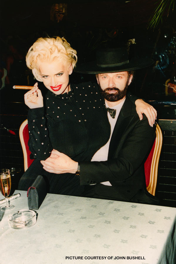 Master artist photographer James Elliott out on the town at a top London nightclub. If you can take your eyes of the femme fatale, it's actually quite a nice shot of EL in his tuxedo and self-made hat. English hatters declined to take on his 'challenge' (his self designed hats have the largest straight brim in the world - tricky). After a quarter of a century of making his own hats, El eventually convinced the Spanish to have a go. They initially declined, though. Shot by paparazzi photographer Jon Bushel. |